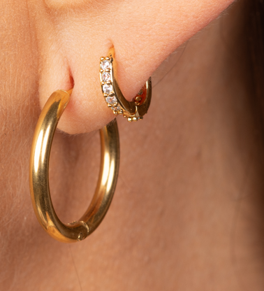 Designed for your daily rotation, the Luna Huggies are small in size but big on detail. Each hoop is set with a row of sparkling crystal zircon stones, offering a clean, light-catching finish that elevates any look. Perfect for stacking or solo wear, they hug the lobe closely for a sleek, minimalist feel.